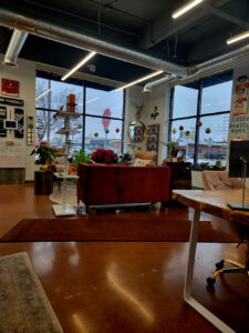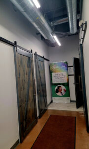 Beatty Eyes sits on a bright corner of a modern Missoula plaza, the kind of spot that naturally fills with sunlight. Inside, the space opens up into a clean, industrial-modern room softened by live plants, and a waiting area that looks more like a stylish living room than a typical optometry practice. Patients can take a seat at the combined optical bar and reception counter — built from corrugated metal with a live-edge top — or settle into velvet chairs around the separate seven-foot live-edge dispensing table while they explore frames. It’s light, comfortable, fun — and unmistakably personal.