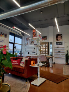 The optical bar and lounge area reflect the practice’s ethos: raw materials softened by cozy textures, personal touches, and plenty of natural light.