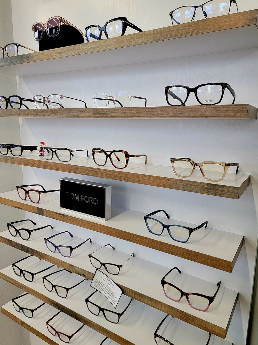 On the optical side, the lineup includes Tom Ford, Etnia Barcelona, and Lafont, with lenses from Essilor (especially Varilux), Shamir, and Zeiss. Daily contact lens offerings center on Alcon, including the Daily Total1 and Precision Series lines. Behind the scenes, Crystal EHR and Coburn edging equipment help keep the workflow efficient.