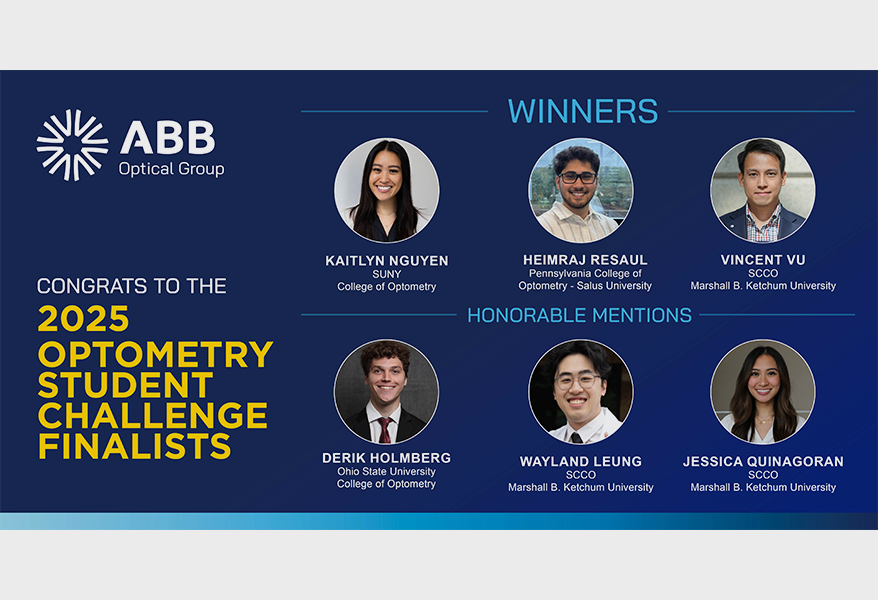 (PRESS RELEASE) CORAL SPRINGS, FL — ABB Optical Group, the largest independent provider of optical services and solutions, is proud to announce the three winners of the 11th Annual Optometry Student Challenge. Kaitlyn Nguyen, Heimraj Resaul and Vincent Vu, were named the 2025 Challenge winners following an interactive webinar presentation on December 11, 2025, where expert judges and over 250 industry professionals alongside family and peers evaluated and voted on their scientific posters.